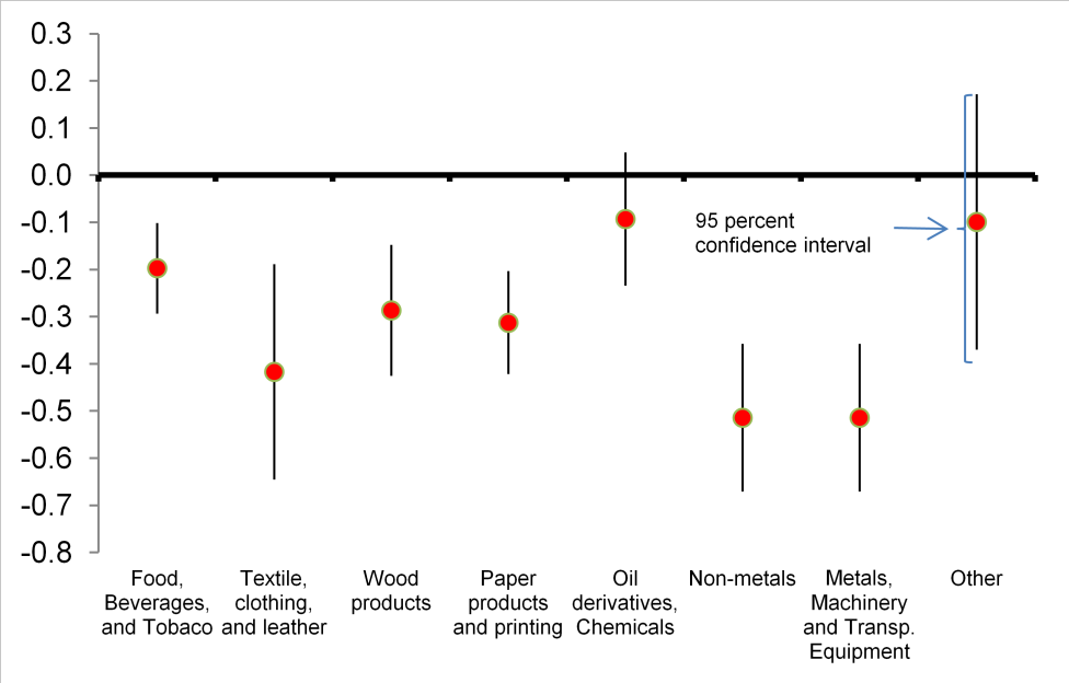 The IMF produced a numbers-heavy analysis on how the Reforms should affect manufacturing in Mexico. Here’s one of the graphics in it, which illustrates how different manufacturing subsectors important to Mexico are negatively effected by increases in energy prices. As they sum it up, all of manufacturing suffers in Mexico when energy prices go up. Even the petroleum industry. (Elasticity was calculated considering both natural gas prices and electricity prices.)